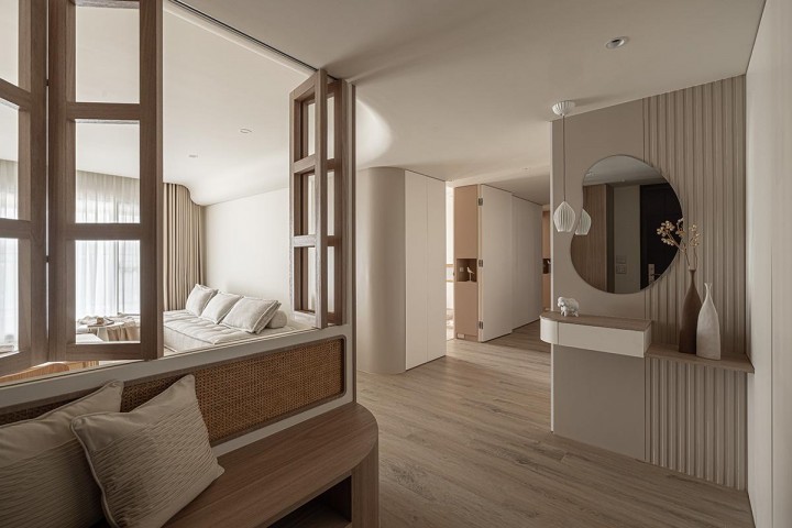 玄關(guān)是返家后的第一道即景,裝修還是蠻大膽的,別具巧思的對開室內(nèi)窗設(shè)計,引領(lǐng)視線方向,提供敞亮視覺感。奶茶色的仿格柵板裝飾玄關(guān)墻面,搭配優(yōu)美弧線的穿衣鏡,削弱剛硬線條,奠定柔美基調(diào)。