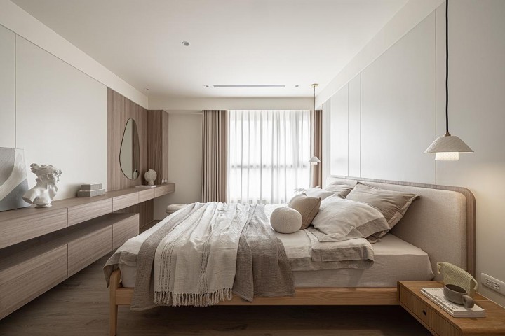 與背景墻相對的床尾,采用雙層平臺設(shè)計,上層不不僅可以收納,還可以滿足日常梳妝需求,下層則可以擺放使用頻率不高的物品,完善的收納建設(shè),保持主臥的整潔有序。