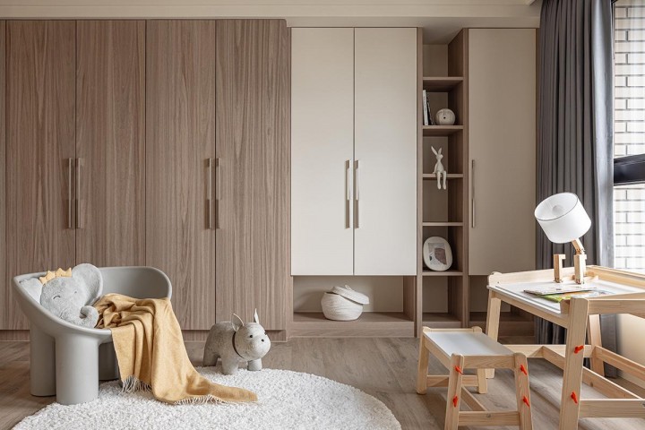 兒童房暫時定位為玩??臻g,給予未來更加彈性可變的空間。除了基礎(chǔ)的收納和軟裝設(shè)計外,還布置了一些兒童家具,滿足涂鴉和繪畫使用需求。