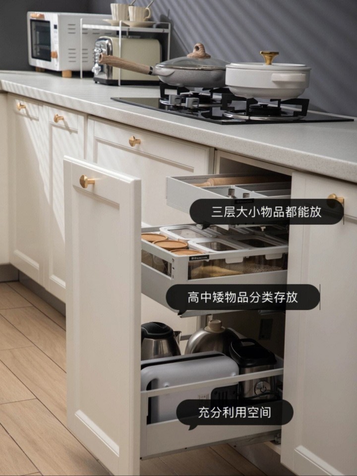 因此,更建議大家可以適當(dāng)增加抽屜式的柜子。每個(gè)抽屜可以容納不同類型和尺寸的物品,減少空間浪費(fèi)。而且抽屜式櫥柜可以輕松拉出,讓你更為清晰地看到櫥柜內(nèi)部的物品,不需要彎腰或探身,取用物品更加方便。