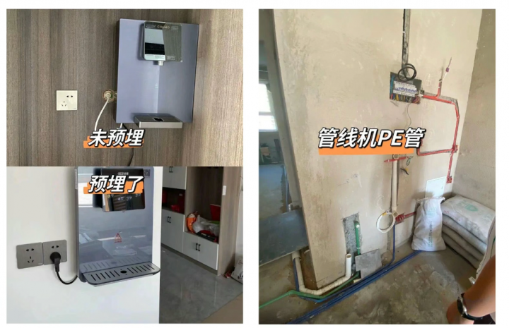 五、管線(xiàn)機(jī)PE管:越來(lái)越多的業(yè)主選擇管線(xiàn)機(jī),它的確解決了我們飲水問(wèn)題,但是它的PE線(xiàn)管真的很亂,提前規(guī)劃提前預(yù)埋,就能解決這個(gè)問(wèn)題。線(xiàn)管隱藏,是很常見(jiàn)的操作,但是目前最常見(jiàn)的為墻排和電視背景墻線(xiàn)路隱藏,對(duì)于其他的大多數(shù)業(yè)主都很少考慮到。