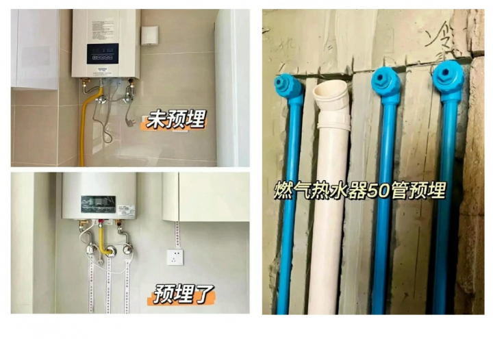 四、燃?xì)鉄崴鞯娜細(xì)夤埽合胍烊粴庹麧嵜烙^,那就要在水電改造時(shí)在廚房區(qū)域墻體中預(yù)埋一根PVC管,這根管打通熱水器與櫥柜下方的連接,燃?xì)夤芸梢灾苯幼邏w(非承重墻的情況下)。尺寸建議選直徑50mm、彎頭45度的管子。因?yàn)槿細(xì)夤苡捕容^高,管道大會(huì)更好穿管。