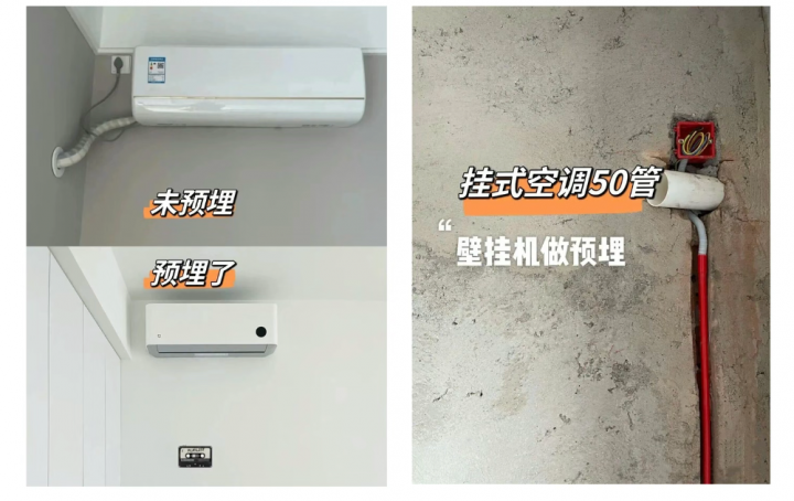 三、空調(diào)預(yù)埋線(xiàn)管:很多空調(diào)的安裝,經(jīng)常踩坑的有兩個(gè)地方,第一是墻面被排水管打洞污染,太鬧心了,完全清洗不掉,第二是電源插座不符合,不是線(xiàn)太長(zhǎng)就是太短。掛壁式空調(diào)內(nèi)機(jī),最好的安裝方法就是提前預(yù)埋50管,然后插座內(nèi)置安裝,把電源線(xiàn)和排水管全部隱藏起來(lái)。