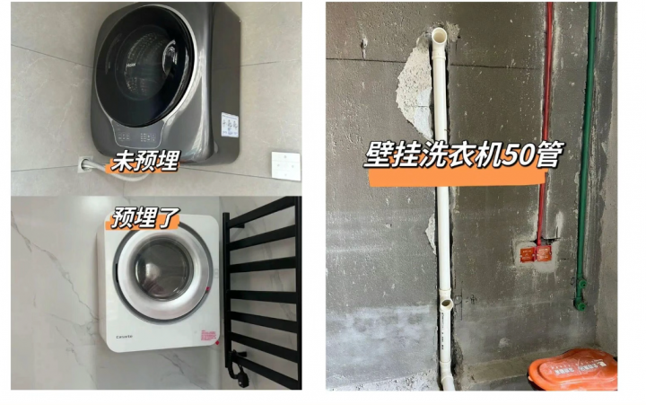六、掛壁洗衣機(jī)埋線(xiàn):掛壁洗衣機(jī)越來(lái)越受歡迎,清洗內(nèi)衣內(nèi)褲真的很方便,性?xún)r(jià)比很高,特別適合懶人。掛壁洗衣機(jī)的安裝,需要涉及到水管和電路,如果都隱藏起來(lái),會(huì)更加好看。在裝修的時(shí)候,提前預(yù)埋掛壁洗衣機(jī)的空間位置,預(yù)埋50水管,預(yù)留插座位置,安裝的時(shí)候方便隱藏進(jìn)水管和排水管。