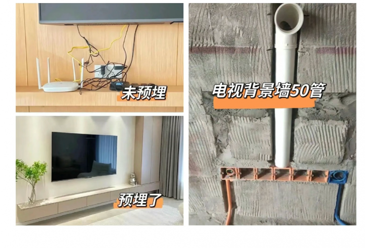 一、電視背景墻預(yù)埋線(xiàn)管:客廳的亂與電視 背景墻的亂有很大關(guān)系。想要電視背景墻美觀,不漏管出來(lái),就要在水電改造時(shí)在電視背景墻體處提前預(yù)埋一根直徑50mm的PVC管。這根管不僅可以電視用,wifi、網(wǎng)線(xiàn)、電源線(xiàn)等都能很好隱藏在電視機(jī)后,美觀又整潔。
