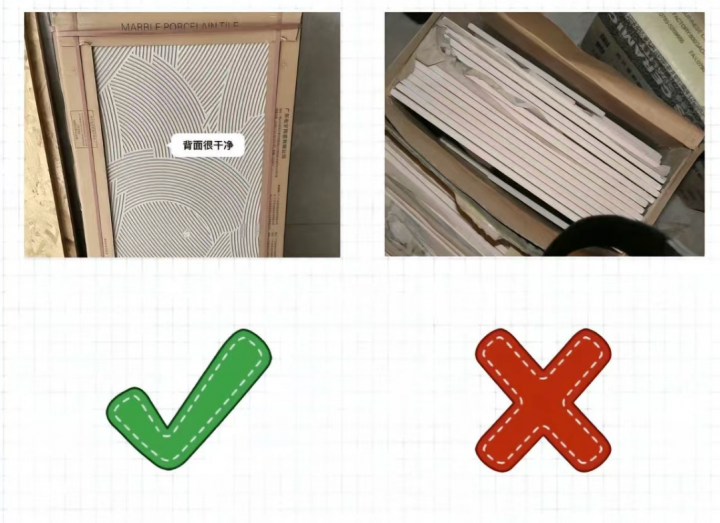 4.瓷磚進(jìn)場要在場,檢查瓷磚有無標(biāo)識,標(biāo)識是否同一色號、批次,有無缺陷破損。檢查有無標(biāo)識,是因為正規(guī)品牌的瓷磚通常會有標(biāo)識,這能體現(xiàn)產(chǎn)品的正規(guī)性和可追溯性。如果沒有標(biāo)識,可能產(chǎn)品來源不明或質(zhì)量難以保證。關(guān)注色號和批次是否同一,是因為即使是同一型號的瓷磚,不同批次在顏色、紋理等方面可能會存在細(xì)微差異。如果不統(tǒng)一,鋪貼后可能會出現(xiàn)明顯的色差或紋路不連貫,嚴(yán)重影響美觀效果,導(dǎo)致整體裝飾效果不協(xié)調(diào)。檢查有無缺陷破損則直接關(guān)系到瓷磚本身的質(zhì)量。有缺陷破損的瓷磚在鋪貼后可能會出現(xiàn)裂縫、不平整等問題,影響使用性能和耐久性,后續(xù)還可能需要進(jìn)行修補或更換,增加額外的成本和麻煩。所以在鋪貼前進(jìn)行這樣細(xì)致的檢查是確保瓷磚鋪貼質(zhì)量和最終效果的關(guān)鍵步驟。