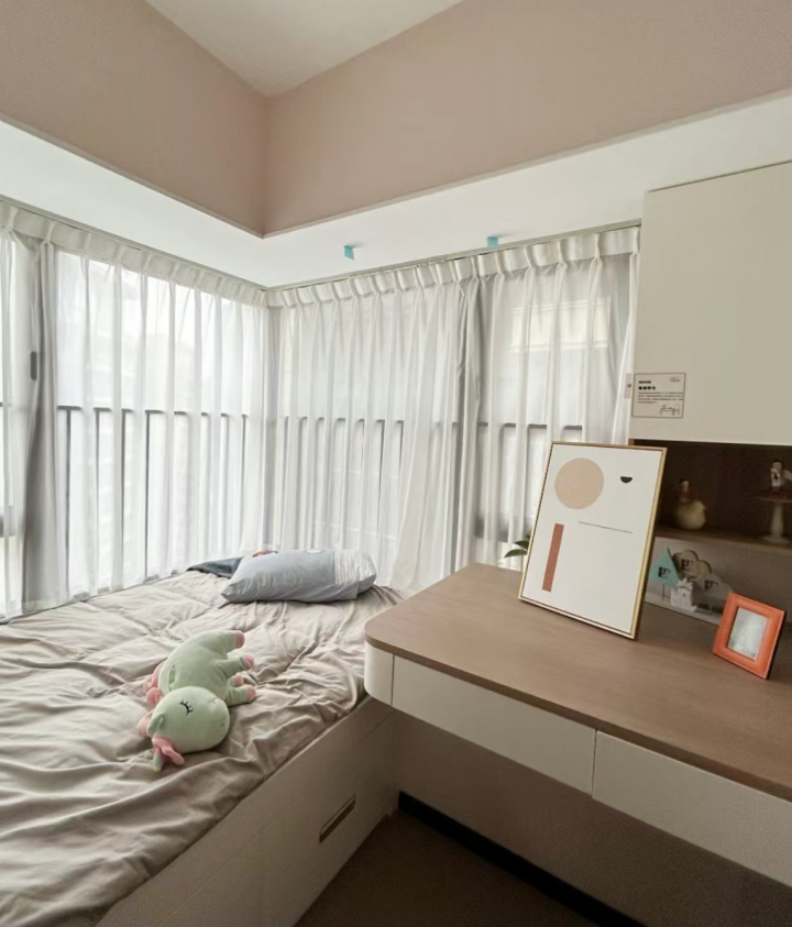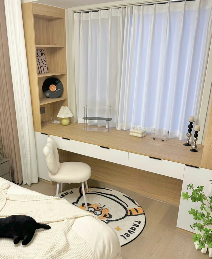 飄窗延伸做書桌:對于飄窗原本高度較低的臥室,可以在原有的基礎(chǔ)上,增加一整排抽屜用來儲物。