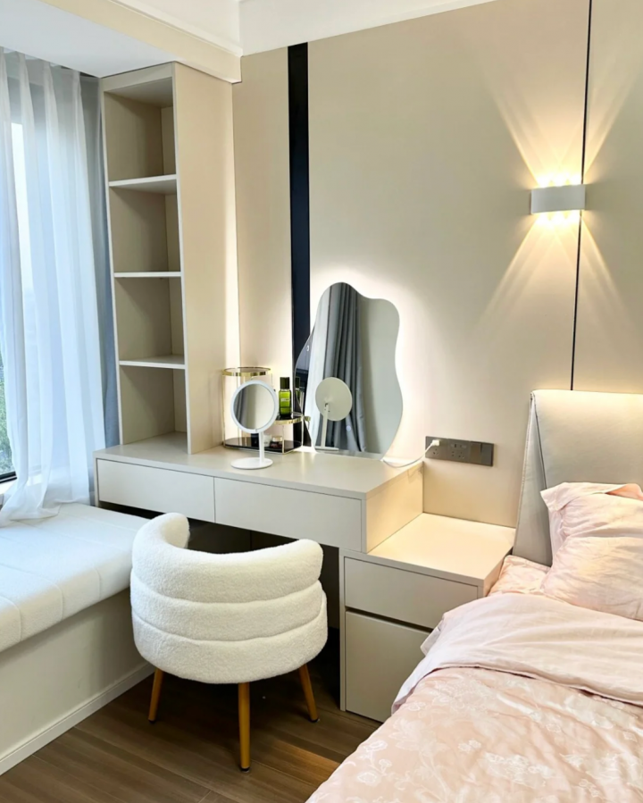 飄窗梳妝臺一體設(shè)計:將梳妝臺延伸到飄窗,可以實(shí)現(xiàn)很多姐妹即想滿足大床頭柜以及衣柜和梳妝臺同時存在的需求。