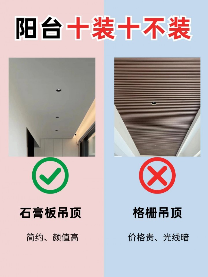 石膏板吊頂簡潔大方,易于安裝和維護,適合陽臺這種需要簡單裝飾的空間。格柵吊頂雖然可以增加空間層次感,但清潔難度大,且在陽臺這種容易積灰的環(huán)境中,容易顯得雜亂。