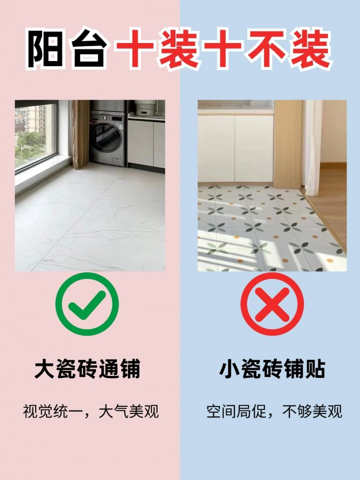大瓷磚通鋪可以減少拼接縫隙,降低清潔難度,同時視覺效果更加統(tǒng)一和大氣。小瓷磚鋪貼雖然可以增加細節(jié)感,但會增加清潔工作量,且在陽臺這種容易積水的地方,縫隙容易藏污納垢。