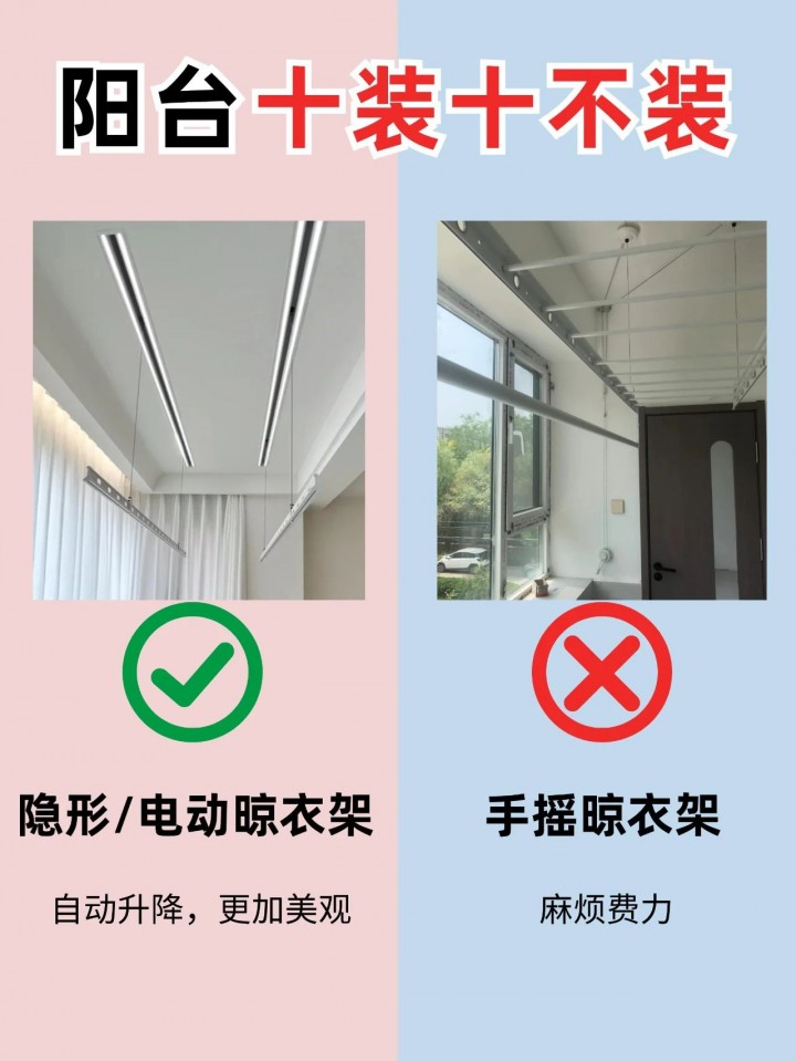 隱形或電動晾衣架不僅節(jié)省空間,使用起來也更加方便,可以提升陽臺的使用效率。手搖晾衣架雖然成本較低,但使用起來較為繁瑣,且占用空間較大。
