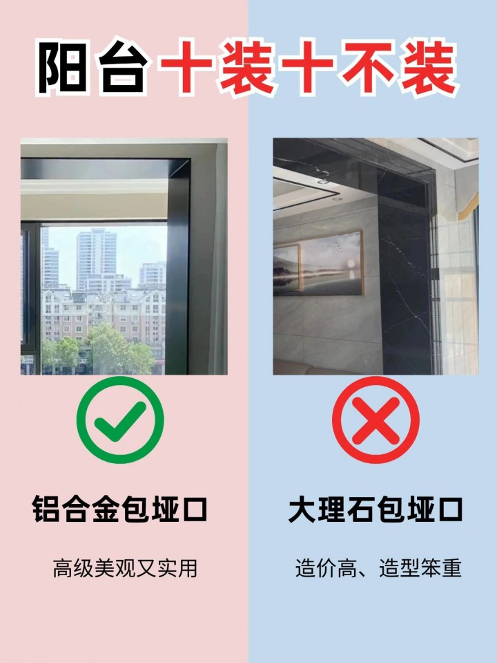 鋁合金材質(zhì)輕便、耐腐蝕,適合用于陽臺埡口的裝飾。大理石雖然質(zhì)感高貴,但重量大,安裝成本高,且在陽臺這種半戶外環(huán)境中容易受潮、變色。