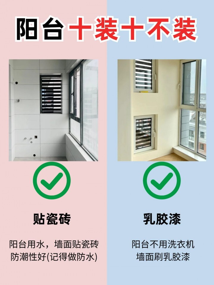 乳膠漆墻面易于清潔,維護簡單,且顏色和質(zhì)感選擇多樣,可以更好地融入室內(nèi)裝修風格。而瓷磚墻面雖然耐用,但在陽臺這種容易受潮的環(huán)境中,容易脫落,且安裝成本較高。