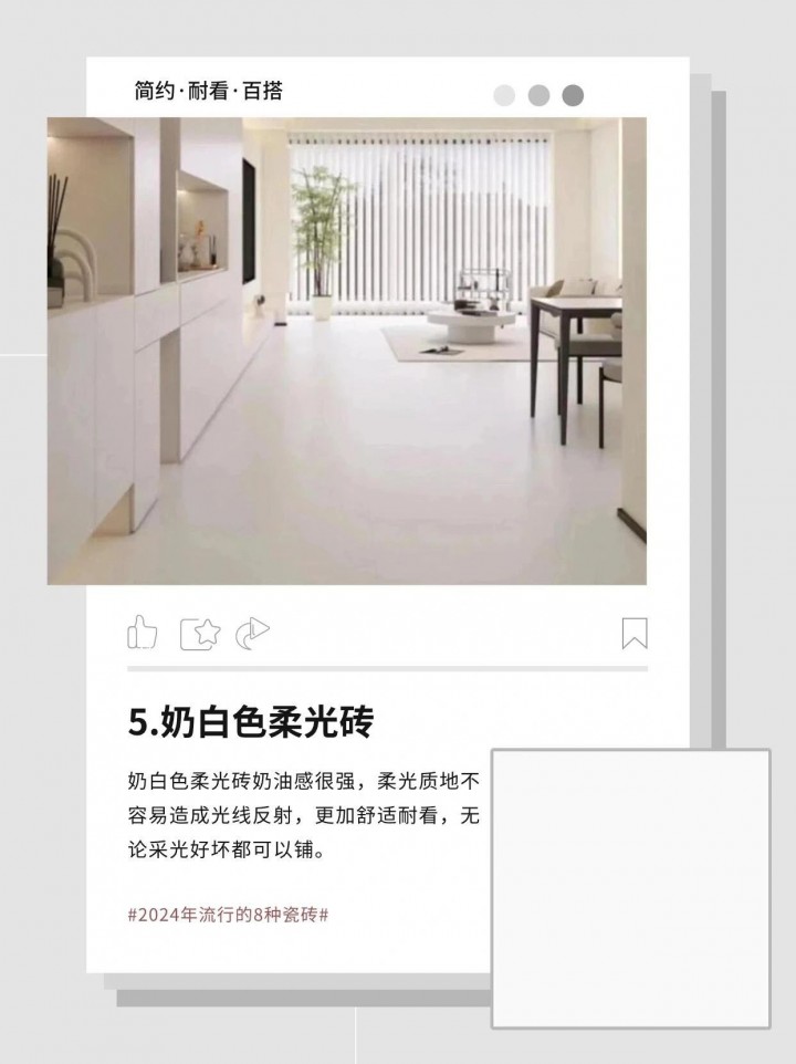 奶白色柔光磚以其奶油感十足的質(zhì)地,不容易造成光線反射,為家居空間帶來(lái)更加舒適的視覺體驗(yàn)。這種瓷磚無(wú)論在采光好壞的環(huán)境中都能鋪貼,展現(xiàn)出其耐看的特性。
