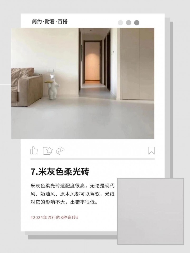 米灰色柔光磚以其高適配度,無(wú)論是現(xiàn)代風(fēng)、奶油風(fēng)還是原木風(fēng),都能完美駕馭。這種瓷磚對(duì)光線的影響不大,出錯(cuò)率很低,是家居裝修中非常安全的選擇。
