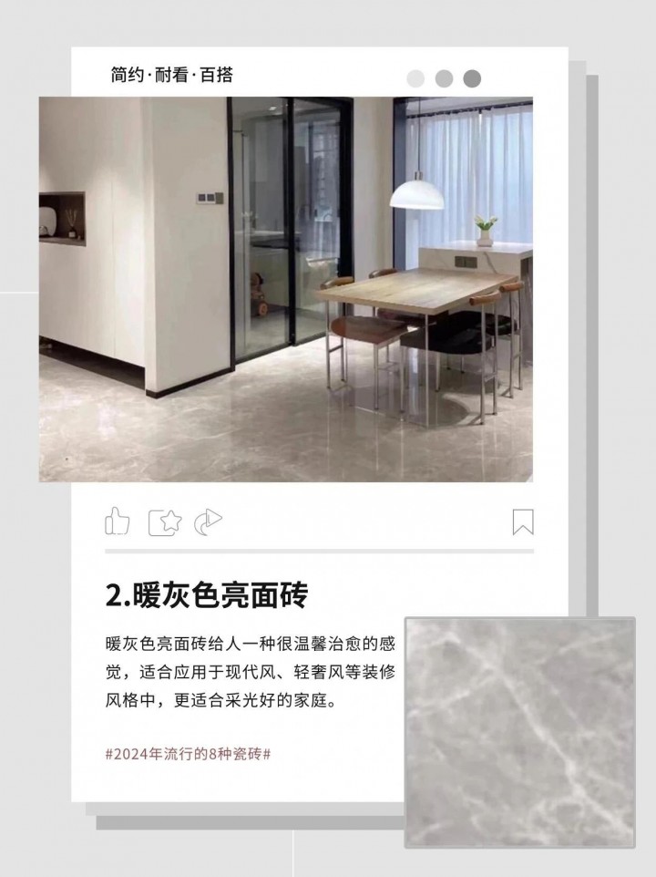暖灰色亮面磚給人一種溫馨治愈的感覺,它的色彩柔和,適合現(xiàn)代風(fēng)、輕奢風(fēng)等裝修風(fēng)格。在采光良好的家庭中,暖灰色亮面磚能夠營(yíng)造出一種溫暖而舒適的氛圍。