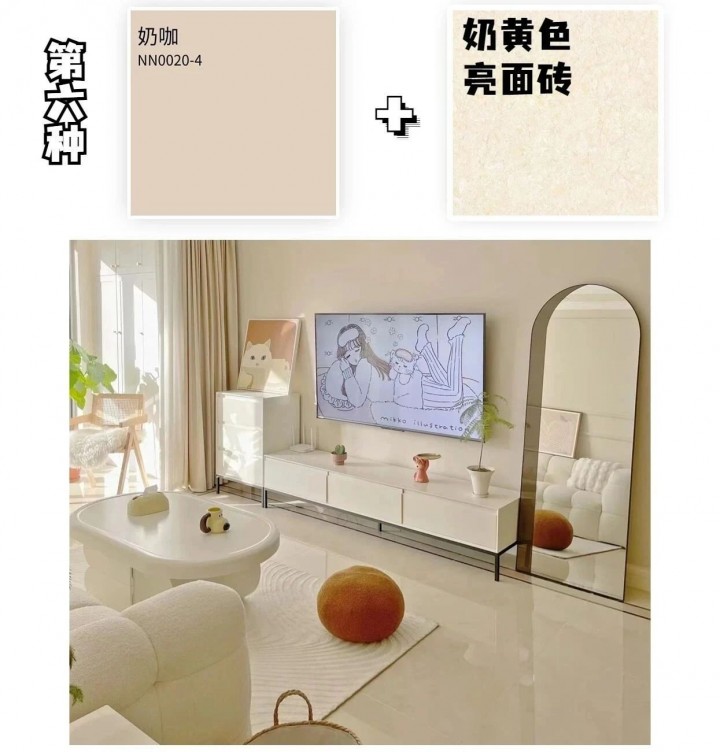 奶黃色亮面磚以其溫暖的色澤和活潑的氣息,適合營造一個充滿活力的家居環(huán)境。搭配奶咖的乳膠漆,整個空間仿佛被一層溫暖的陽光照耀,充滿了生機(jī)與活力。奶咖的柔和與奶黃色的明亮相互融合,為家居空間帶來了一種溫馨與愉悅的感覺。這種配色方案非常適合兒童房或游戲室,能夠激發(fā)孩子們的想象力與創(chuàng)造力。