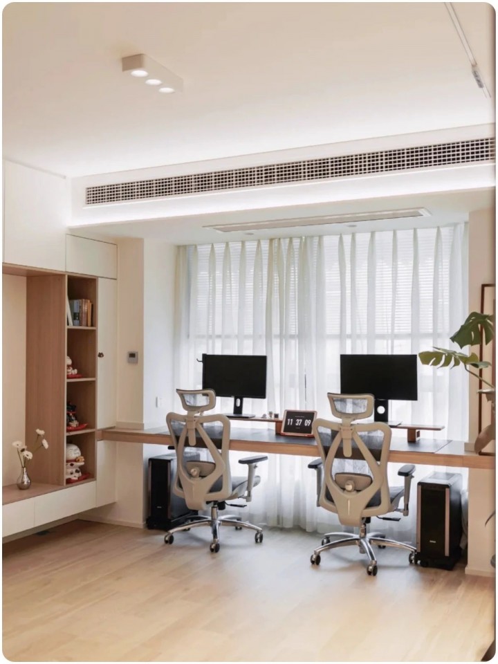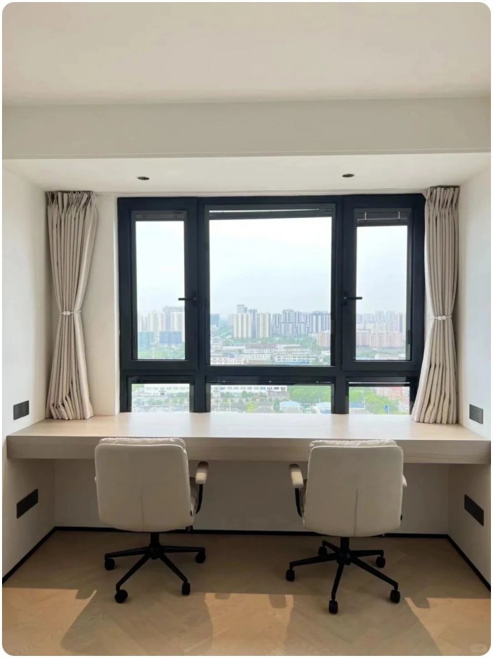 ▲同體書桌采用右側(cè)落地柜,以滿足日常儲物需求,懸浮層板貫通設(shè)計(jì),讓空間更具高級感,可以在辦公和學(xué)習(xí)之余欣賞窗外美景。