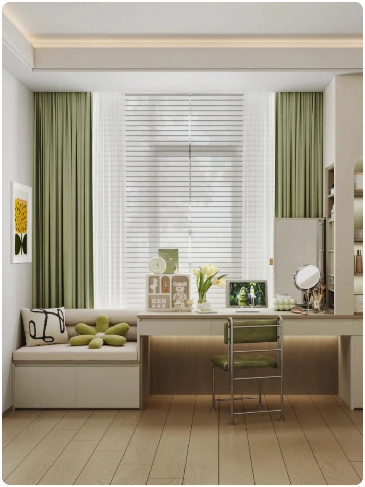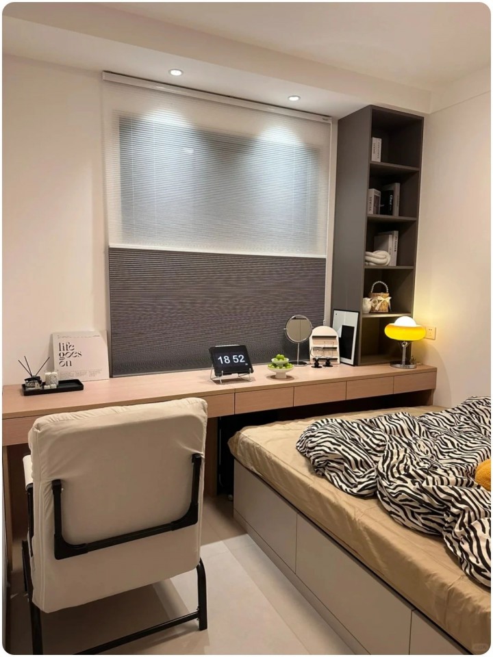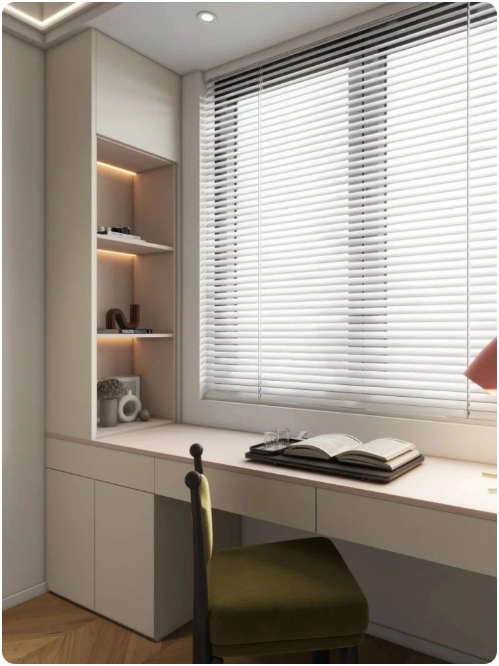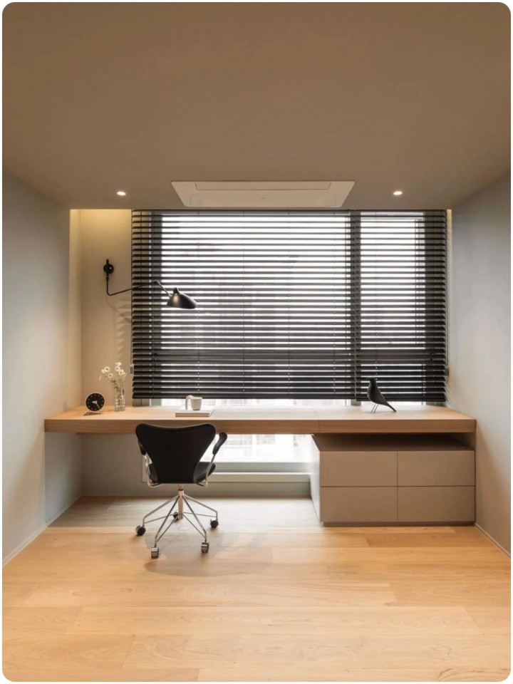 ▲窗戶兩側(cè)進(jìn)行定制收納,同時(shí)在中間延伸書桌,為學(xué)習(xí)提供更多空間。搭配窗戶百葉簾,營造出柔和的光線,合理利用了空間。