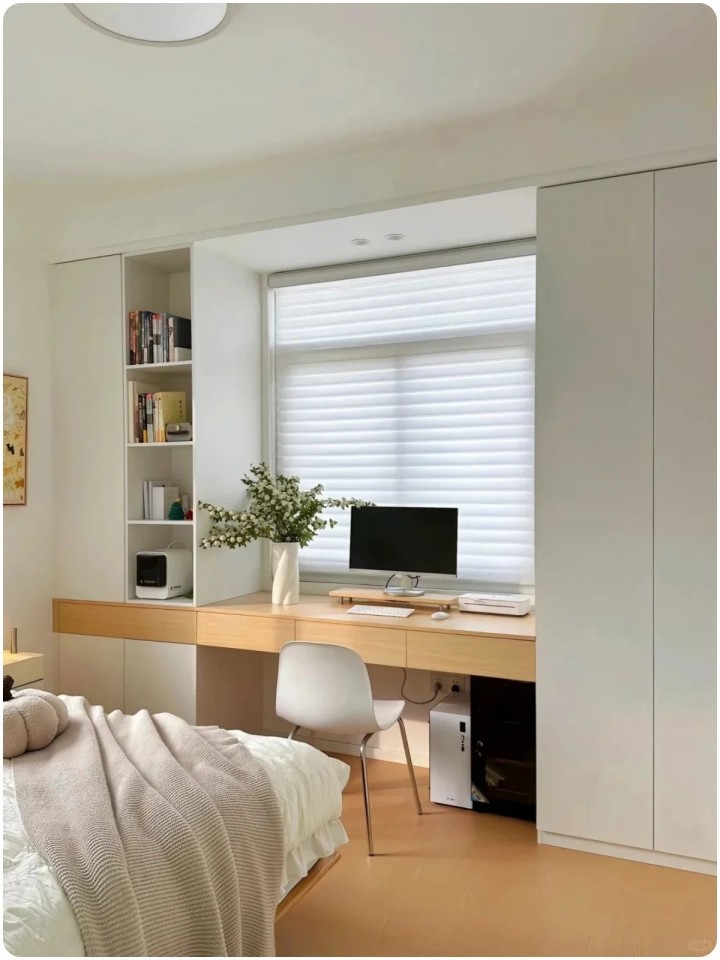 臥室有窗戶的位置建議功能化設(shè)計(jì),特別是需要學(xué)習(xí)或辦公時(shí),窗邊可以設(shè)計(jì)書桌,充分利用光線。被墻擋住的地方可以做柜子,便于收納。