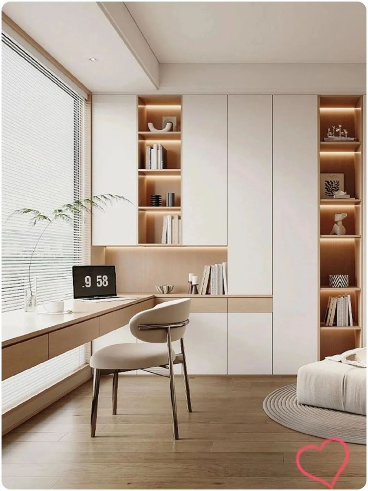 ▲窗戶兩側(cè)擺放書柜和收納柜形成對稱,中間設(shè)有懸空書桌,既能滿足收納需求又能實(shí)現(xiàn)學(xué)習(xí)需要。