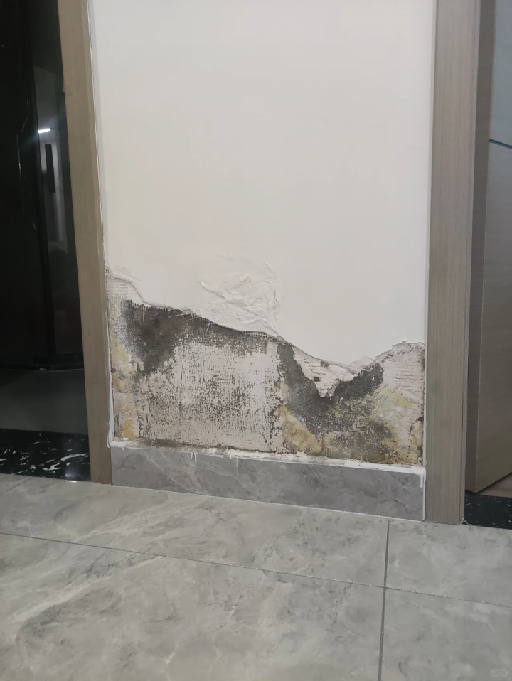 衛(wèi)生間門(mén)口墻面反堿還有一個(gè)原因就是做防水的時(shí)候,衛(wèi)生間門(mén)口沒(méi)有做攔水壩。