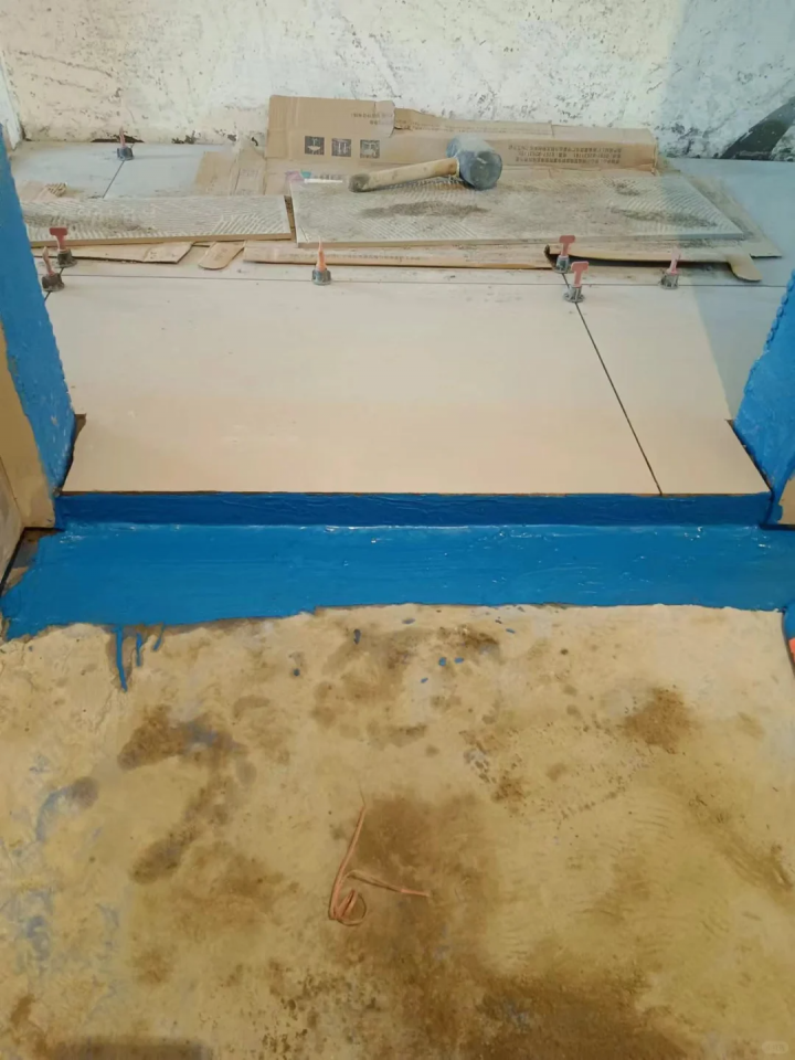 這時(shí)候一定先不要貼衛(wèi)生間里面的地磚,先用水不漏或者防水膠把這個(gè)砂漿層的側(cè)面刷上,并且用水不漏把門(mén)口地磚兩側(cè)的縫隙也填上,等這個(gè)側(cè)面的防水或者水不漏干了之后再貼衛(wèi)生間的地磚。