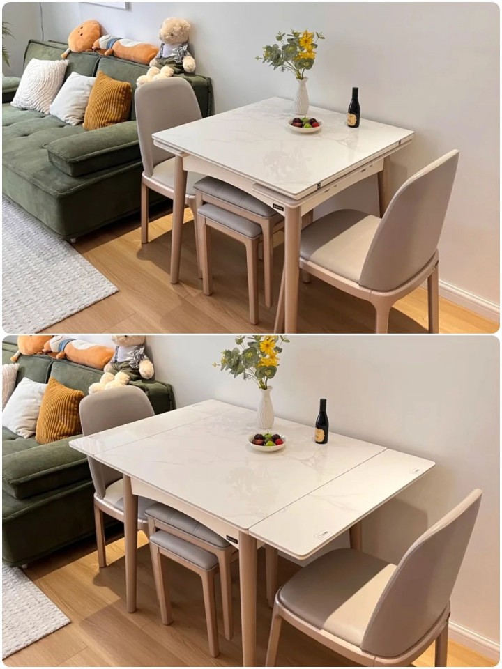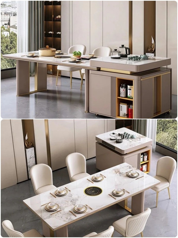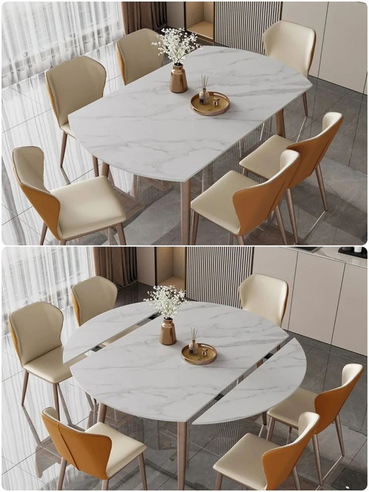 ▲桌變圓桌的巖板餐桌是目前的主流設(shè)計。巖板具有耐高溫、耐磨、耐刮、低滲透、高硬度的特點。這種非常節(jié)省空間,平時可收縮成方桌,一家人用餐時使用。當(dāng)有親朋好友來訪時,可展開成圓桌,輕松容納多人就座。