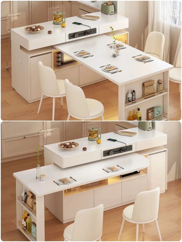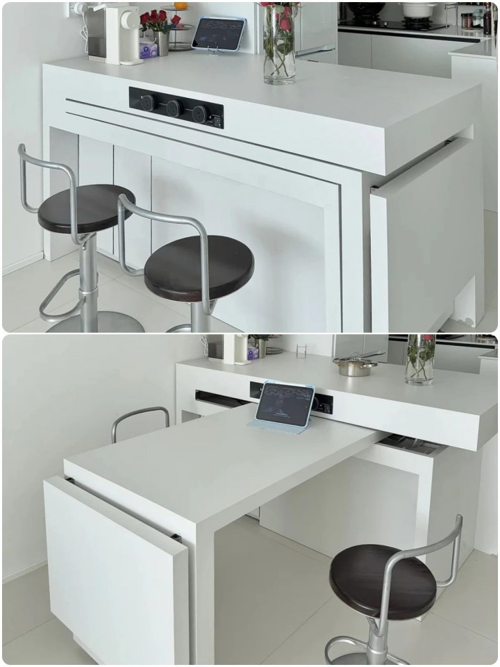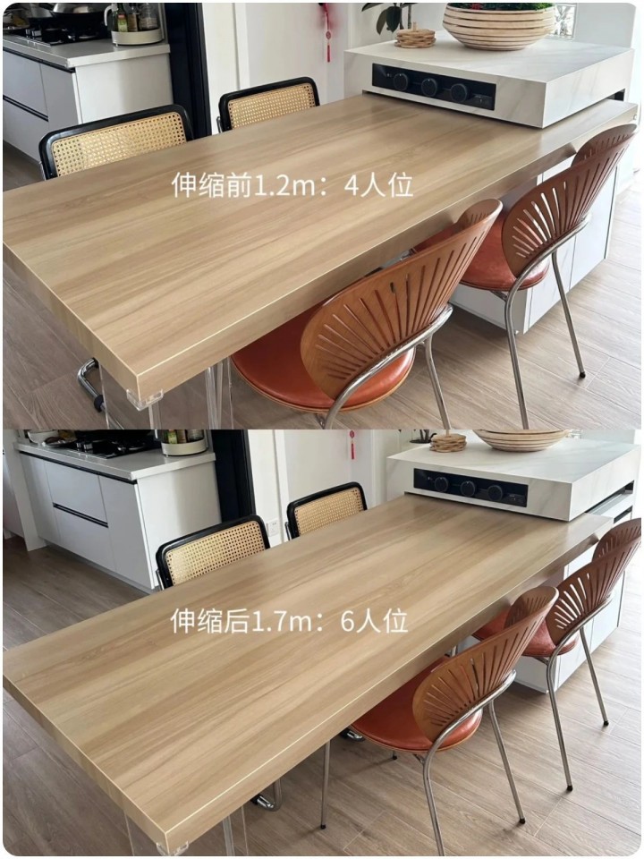 ▲島臺升級版,可伸縮式餐桌,滿足不同功能需求。縮進(jìn)時1.2米,展開后1.7米,可容納多人。