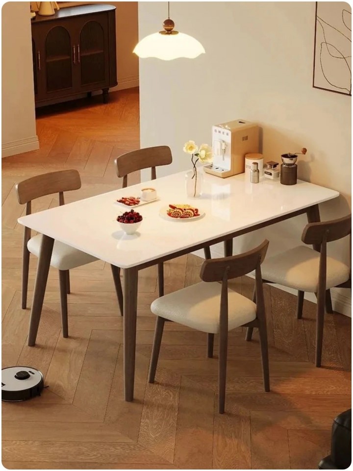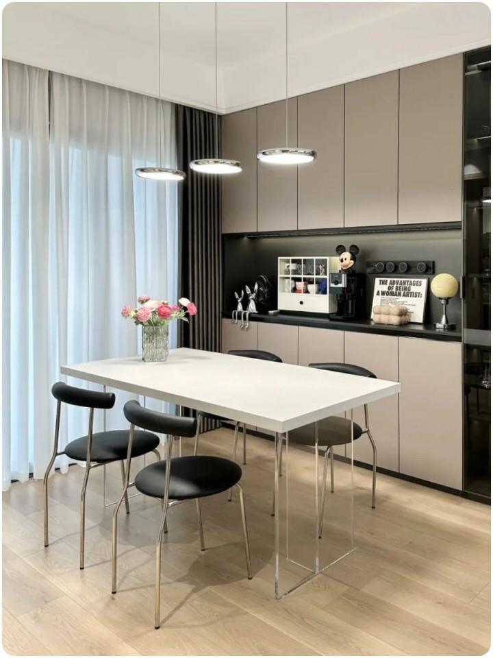 ▲如圖所示,長方形餐桌是常見的選擇,其規(guī)整的造型非常適合小戶型餐廳的角落。它既是孩子學(xué)習(xí)的場所,也是朋友聚餐時擺放美食的理想平臺。一家人圍坐用餐,即使空間有限,也能營造溫馨的氛圍,實用性極高。