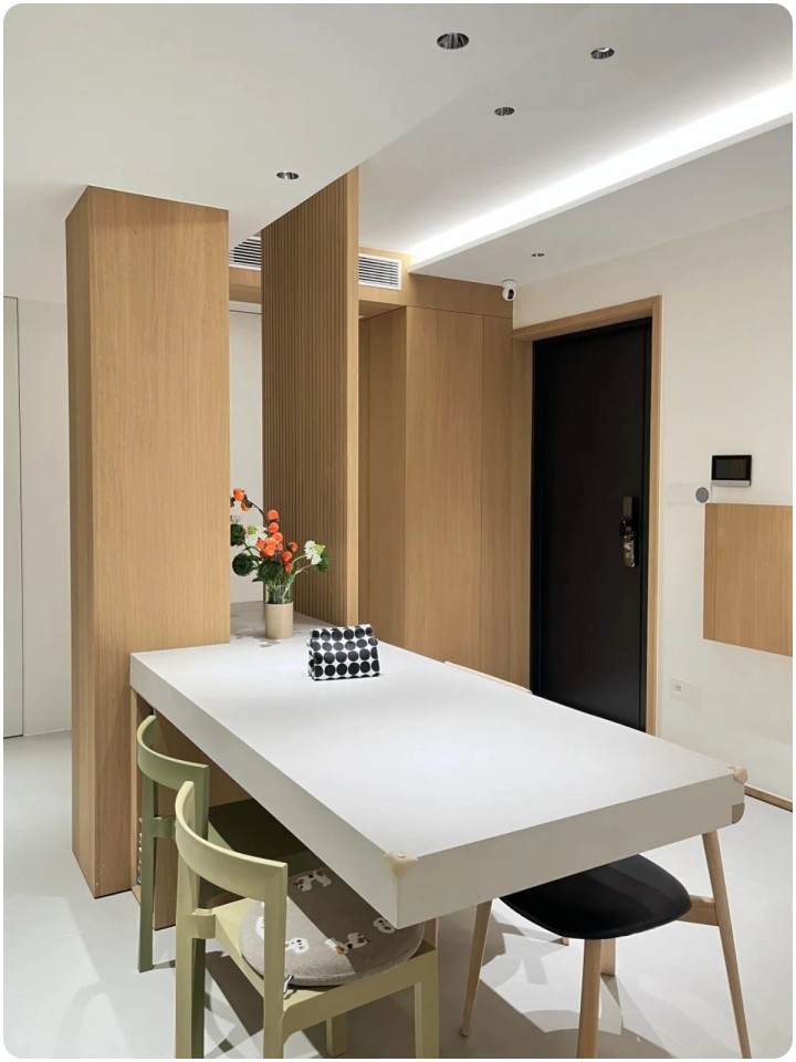▲小戶型開放式廚房,餐桌兼顧廚房臺面,擴(kuò)大視覺空間,提升室內(nèi)空間感。