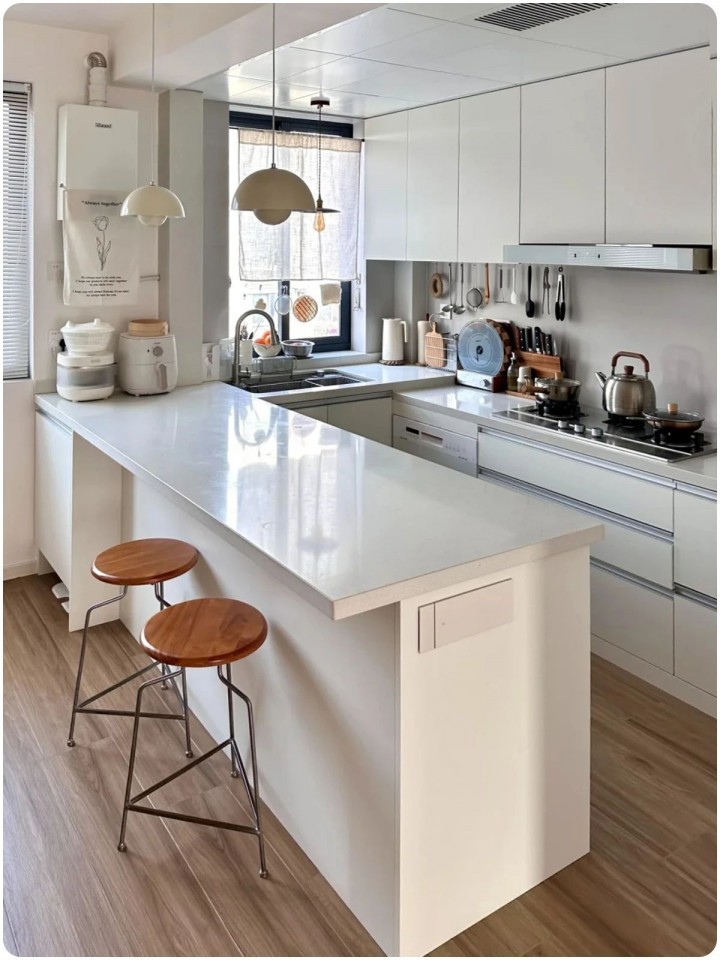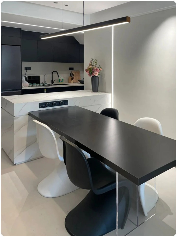 ▲島臺與長桌組合是小戶型常見方案,搭配開放式廚房,現(xiàn)代感十足。成品或現(xiàn)場定制均可實現(xiàn),成品更具性價比,是現(xiàn)代家裝的優(yōu)選。