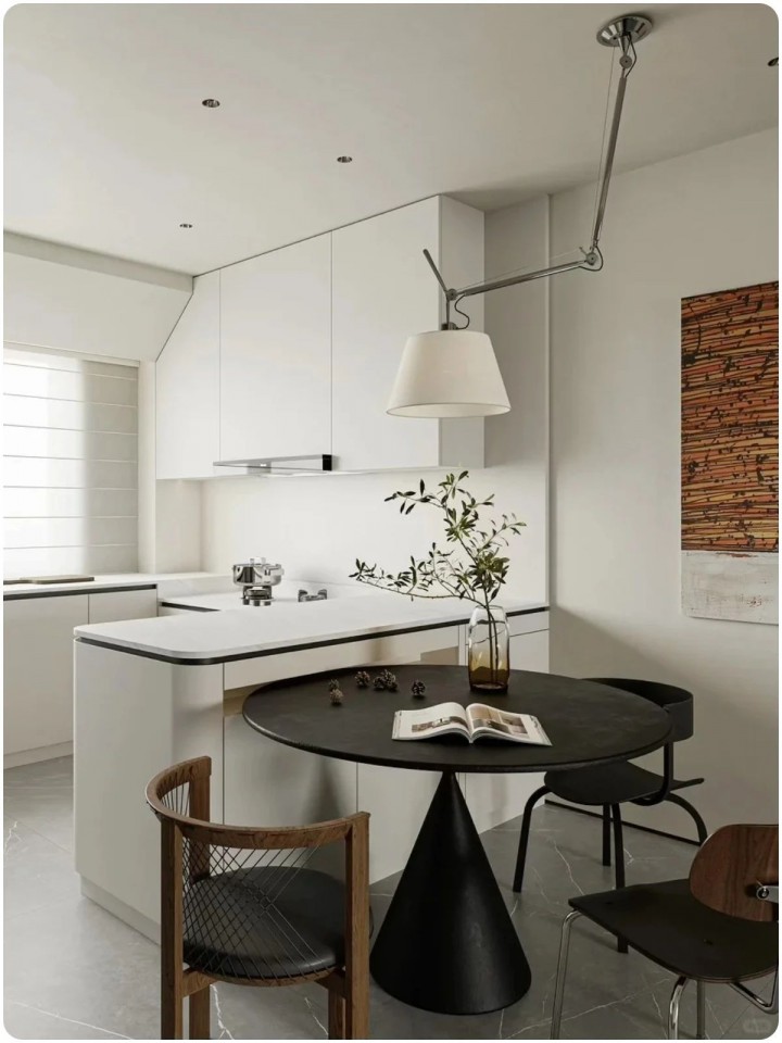 ▲ 延伸廚房臺面作為餐桌島臺,搭配圓形餐桌,滿足不同用餐人數(shù)需求,最大化小型開放式廚房的實用性。黑白灰與實木色系的搭配,營造中古風(fēng)格。