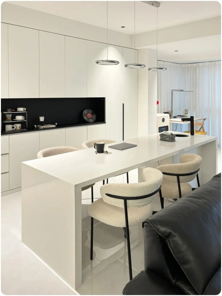 ▲對于大戶型,定制島臺餐桌能提升家居顏值。島臺具有更高的實用性,可滿足多人就餐的需求。石英石臺面光滑耐用,易于清潔,且不易開裂。
