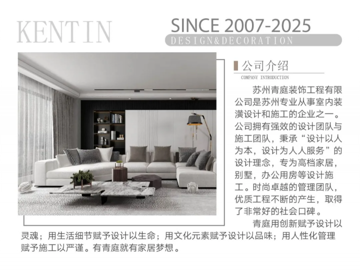 在蘇州這座充滿詩(shī)意與韻味的城市,有一家在裝飾領(lǐng)域嶄露頭角的企業(yè) —— 蘇州青庭裝飾。本公司成立于2007年,至今已有18個(gè)年頭,它宛如一顆璀璨的新星,以獨(dú)特的企業(yè)文化為畫筆,精心勾勒出一幅幅品質(zhì)家居的絢麗畫卷。