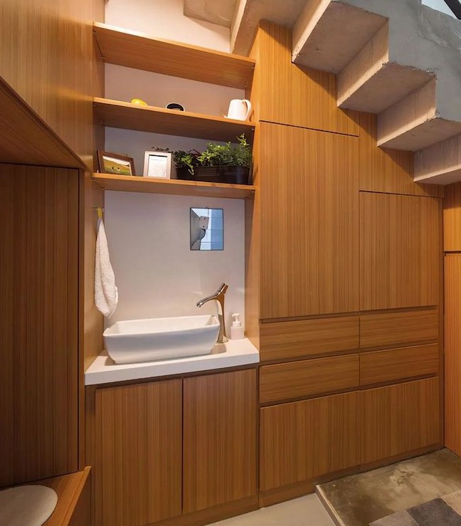 洗漱臺的空間占用不會太大,可以根據(jù)自家的情況,進(jìn)行樣式的變化,可以是這樣一小格,也可以單獨拿出一個墻面作為洗漱臺。唯一要注意的是,下水、防水的提前安排。