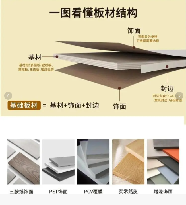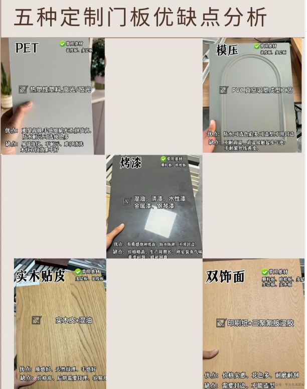 5.PET膜 PET作為一種食品級環(huán)保材料(常用于礦泉水瓶),將其制成門板表面材料,可分為高光(光澤度≥95°)和啞光(膚感)兩種效果。 膚感PET門板觸感猶如嬰兒肌膚,而高光PET則具有出色的反光效果,能讓小空間顯得通透。市場價格較高,但耐刮性能出眾(硬度可達3H)。需注意啞光表面油污應及時用專用清潔劑處理,避免留下痕跡。 選購決策指南 1. 預算優(yōu)先:選擇雙飾面或吸塑門板 2. 風格需求:歐式選吸塑,現(xiàn)代選PET或烤漆,中式選實木貼皮 3. 性能考量:潮濕環(huán)境選烤漆或吸塑,高溫區(qū)域避開PET 4. 環(huán)保標準:查看檢測報告,確定環(huán)保等級