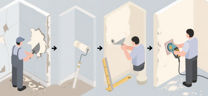 先觀察墻面是否有空鼓、開裂、脫落:用小錘輕敲墻面,空鼓面積超過 10cm2 或連續(xù)空鼓需鏟除;裂縫需區(qū)分是結(jié)構(gòu)性(貫穿墻體)還是表面性(僅表層),結(jié)構(gòu)性裂縫需先加固墻體,表面性裂縫可直接修補(bǔ)。