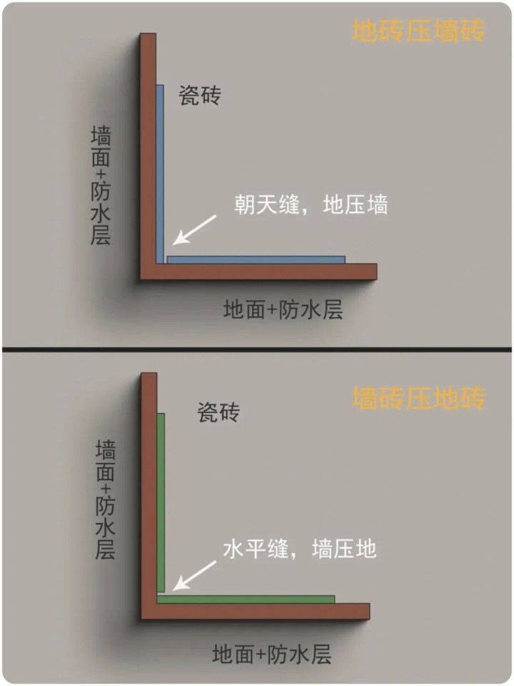 在衛(wèi)生間裝修的討論中,“地壓墻” 和 “墻壓地” 常被貼上 “防水關(guān)鍵” 的標(biāo)簽,甚至有人將漏水問題直接歸咎于工藝選擇,但事實(shí)上,這兩種工藝本質(zhì)只是地磚與墻磚的鋪貼順序差異,與后期是否滲水沒有直接關(guān)聯(lián)。所謂 “地壓墻”,是先貼墻磚再鋪地磚,墻磚底部與地磚邊緣形成垂直磚縫;“墻壓地” 則先鋪地磚再貼墻磚,形成水平磚縫。無論是垂直縫還是水平縫,本身并非防水屏障,瓷磚縫隙的密封性才是決定是否滲水的核心 —— 若磚縫未做有效密封,即便選 “地壓墻”,水汽仍會(huì)滲入基層;若密封到位,“墻壓地” 的水平縫也能阻擋滲透,將滲水風(fēng)險(xiǎn)歸因于工藝選擇,實(shí)則混淆了 “工藝形式” 與 “密封本質(zhì)”。