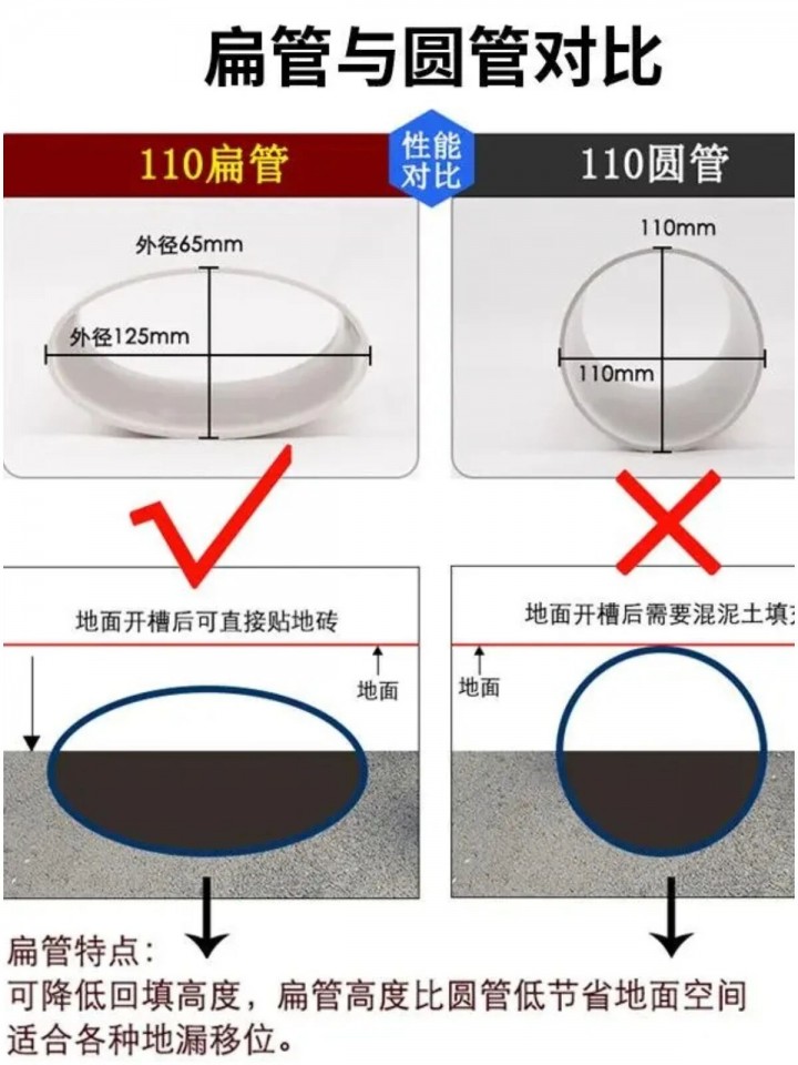能用110圓管絕不用110扁管。大多是由于貼磚高度受限必須用110的扁管,110扁管相較于110圓管,整體厚度只有60-70mm之間,加上地面開幾厘米槽,不會(huì)增加衛(wèi)生間貼磚高度,所以110扁管常用于馬桶移位使用。
