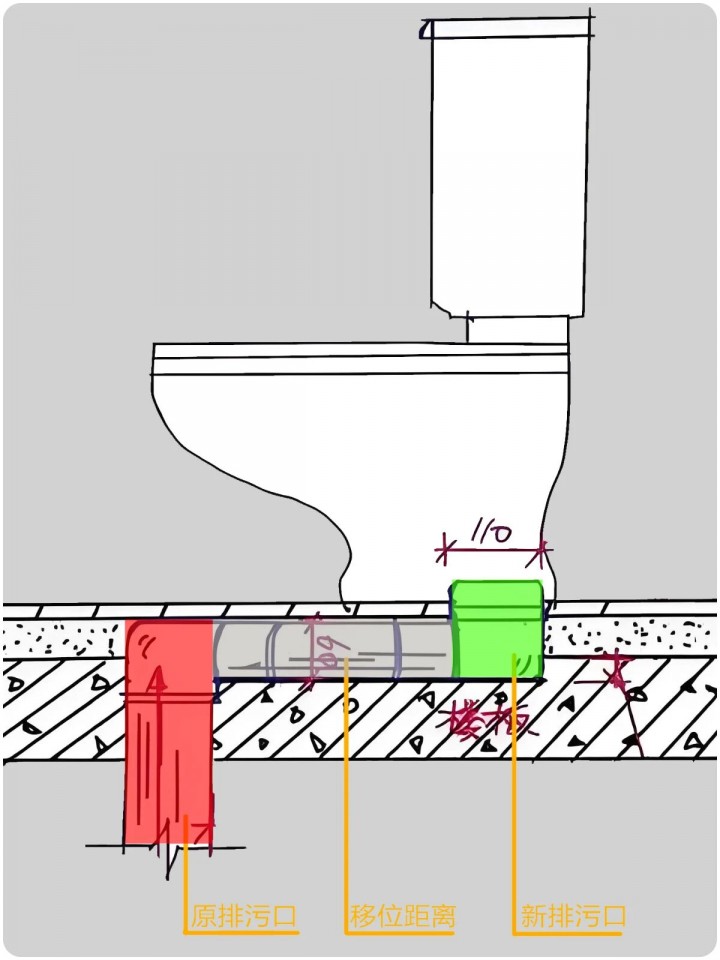 短距離馬桶移位可以購(gòu)買成品移位器,超過(guò)20cm可能就需要水電工現(xiàn)場(chǎng)裁切扁管,調(diào)整下水坡度。