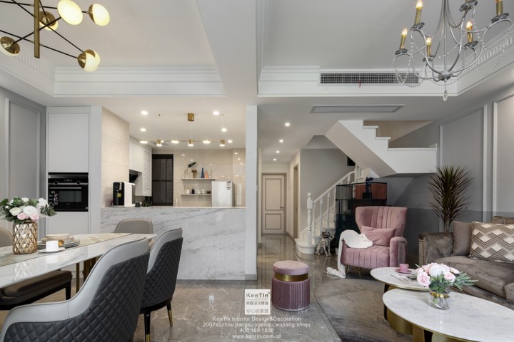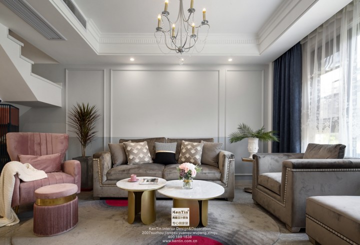 客廳背景墻和吊頂?shù)木€條感將整個(gè)空間的格局強(qiáng)烈劃分,軟裝色彩跳躍又柔和,材質(zhì)是絨布沙發(fā)與金屬感較強(qiáng)的包邊結(jié)合,既顯露出濃濃的浪漫主義色彩又不失穩(wěn)重。