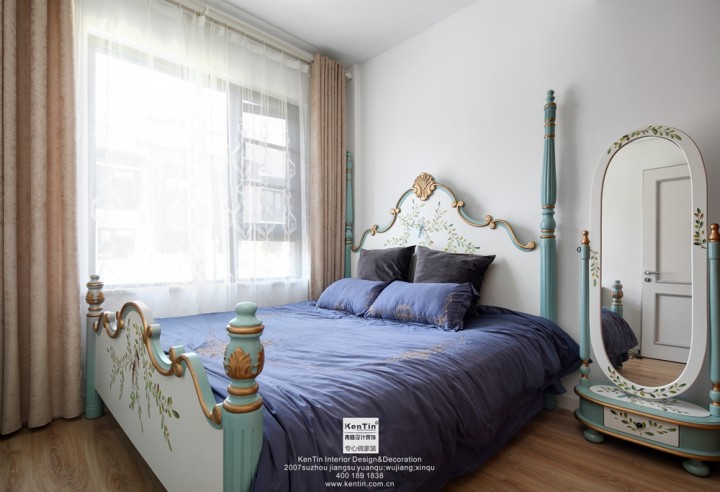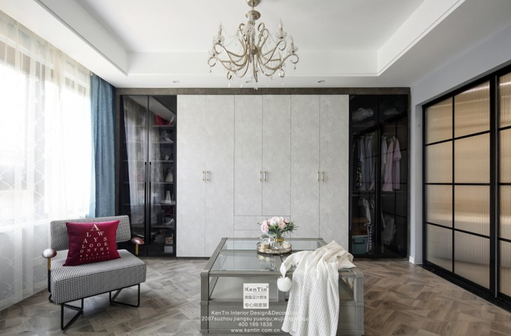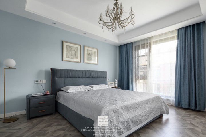 主臥墻面色彩淡藍(lán)色,與床、窗簾等呼應(yīng)起來,并無過多的裝飾物。而考慮到衣帽間的實(shí)用性,其儲物空間也大大增加。