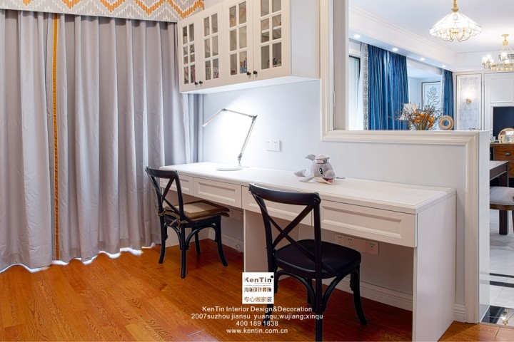 餐廳和書房采用“半墻主義”,讓獨(dú)立區(qū)分的空間之間有了親密的互動性,布局也被打通,視野更加開闊,書房里的柜子也大大增加了收納效果。在看書的時候,抬頭便可以看到客廳里滿溢的陽光。