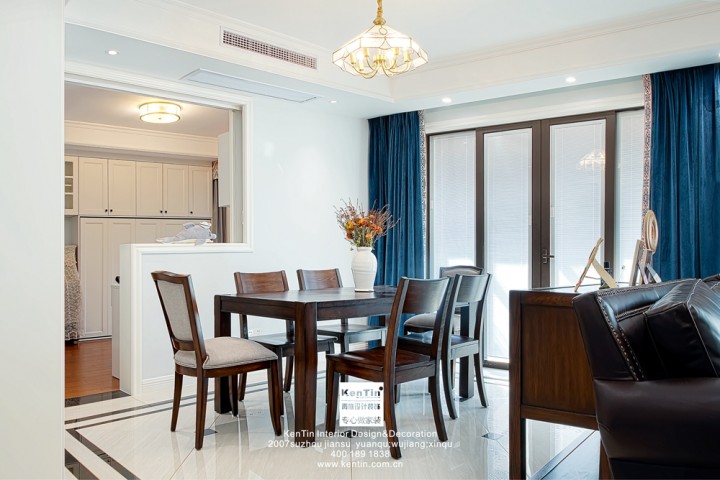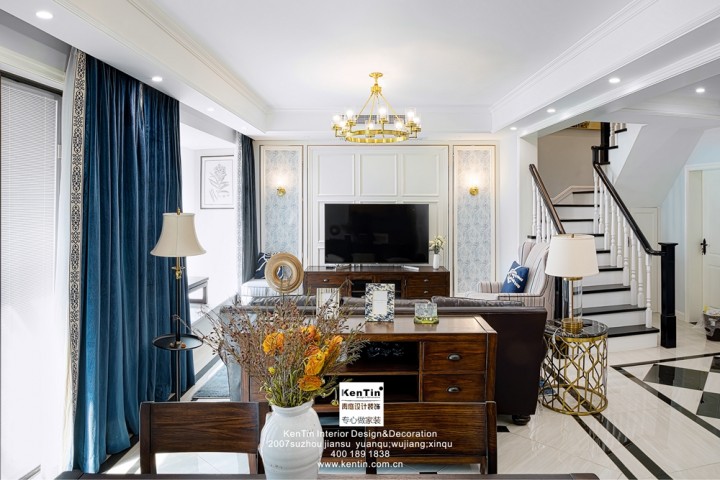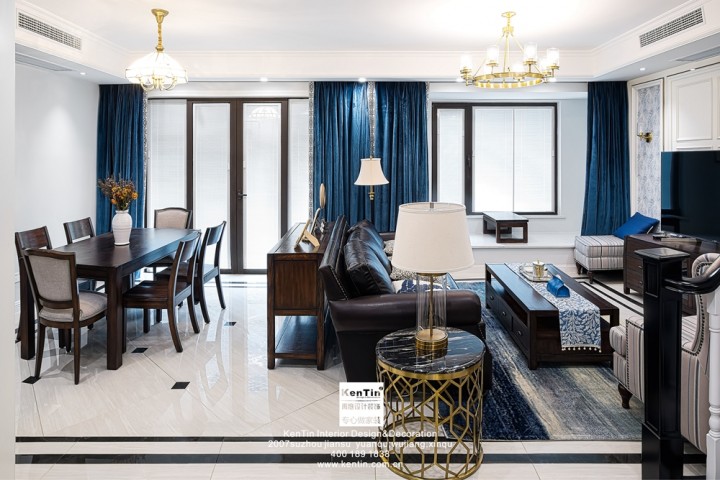 客廳的整個空間呈現(xiàn)黑色、白色、藍(lán)色的絕美格調(diào),茶幾、燈飾點(diǎn)綴金色元素,為空間融入幾分靈動和耀眼,低調(diào)奢華。藍(lán)色的窗簾、靠枕為家中注入溫和和浪漫,讓久處其中的你平靜和幸福。