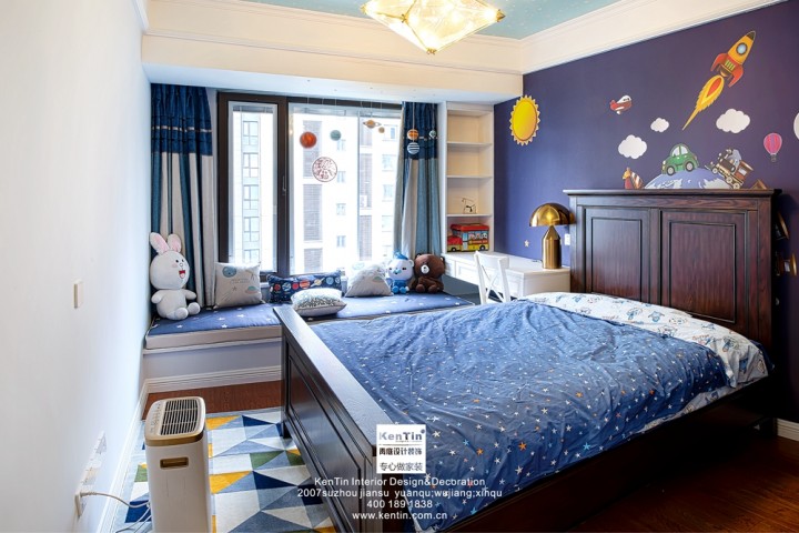 次臥童趣盎然,柔軟的地毯圖案和顏色別具一格,可以想象孩子在地毯上盡情歡樂玩耍的場景。深藍(lán)色的床品上滿是五彩的星星,孩子晚上的夢里也仿佛繽紛多趣,一夜酣睡到天亮。