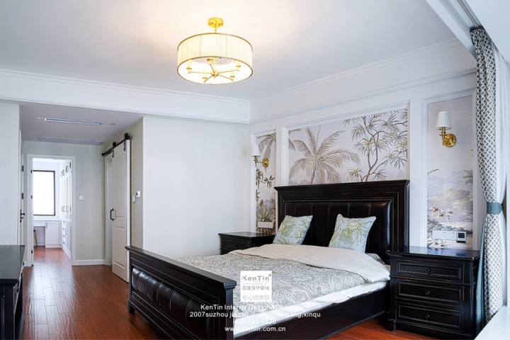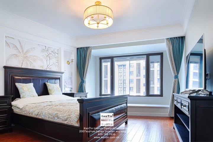 主臥穩(wěn)重高雅,柔和的燈光像愛一樣灑在棕紅的地板上,輝映出主人浪漫的情調(diào)。白色的墻面和門,讓空間純潔淡雅,黑色的床和柜子,給柔和的空間注入硬朗。窗簾由湖藍(lán)和灰白格兩段糅合在一起,嫻靜端莊。