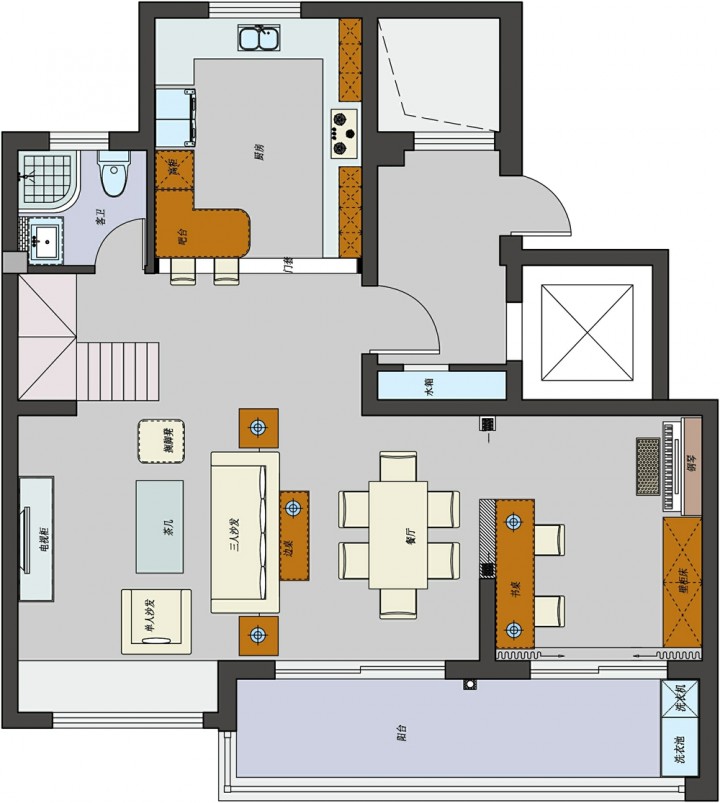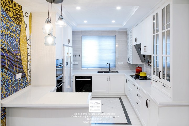 廚房潔白神圣,儲物空間充足,同時妻子想要的家電都合理嵌入櫥柜中,省下了空間,又十分美觀??拷鼧翘萏幍膲γ媸忠俗⒛?,黃色、藍(lán)色、黑色等以小格子為單位組成妙趣的畫,給廚房錦上添花。