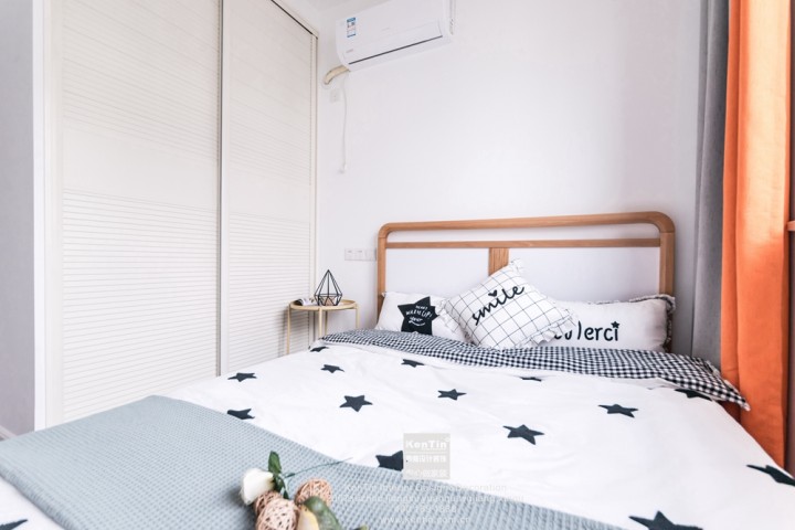 和主臥相比,次臥的用色更加讓人眼前一亮。大片的純白色,淺色的床和小桌幾,一切看起來都是無瑕的,這樣的色彩搭配使得窗簾更加亮麗,床上用品的黑白搭配也在附和著臥室的冷清之感。而橙色的窗簾打破純白色帶來的安寧,創(chuàng)造無限的生機與活力。