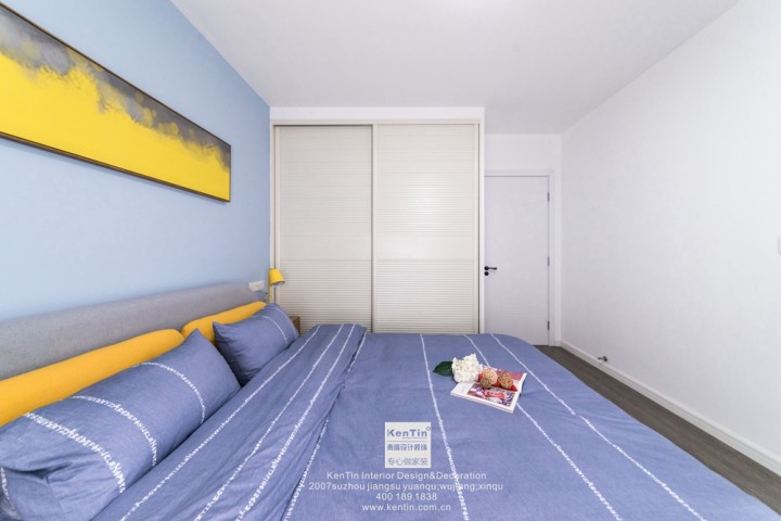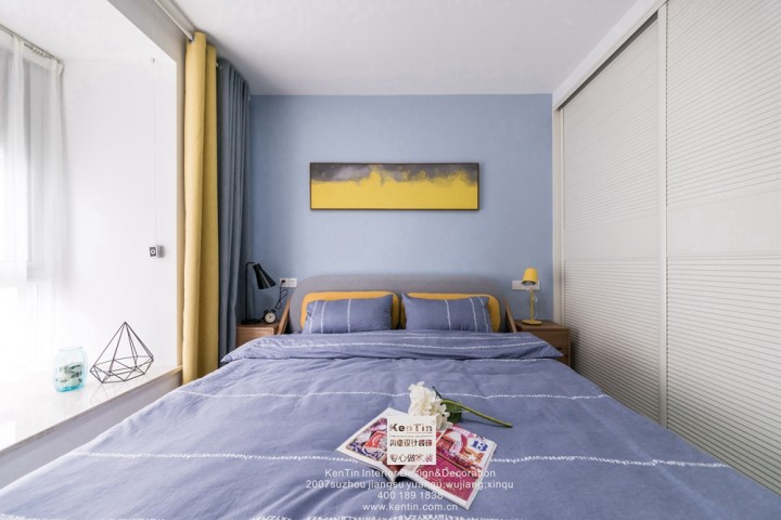 靜謐的藍搭上活力的黃色,再輔以大片的白,主臥給人的感覺十分安靜柔和。床兩邊各擺放一個床頭柜,一黑一黃的臺燈分別放在柜子上,使用非常方便。通透的采光和淺色的設計使臥室一塵不染,呆在這樣的環(huán)境里,心情都會很舒暢,一個人可以安靜的享受閑暇時光。